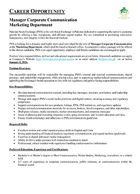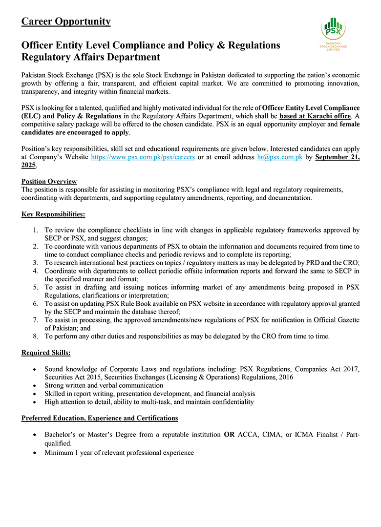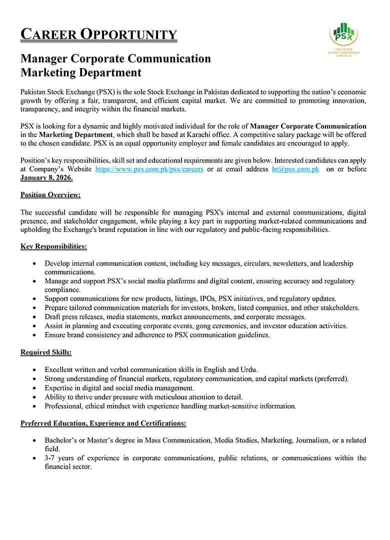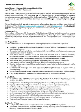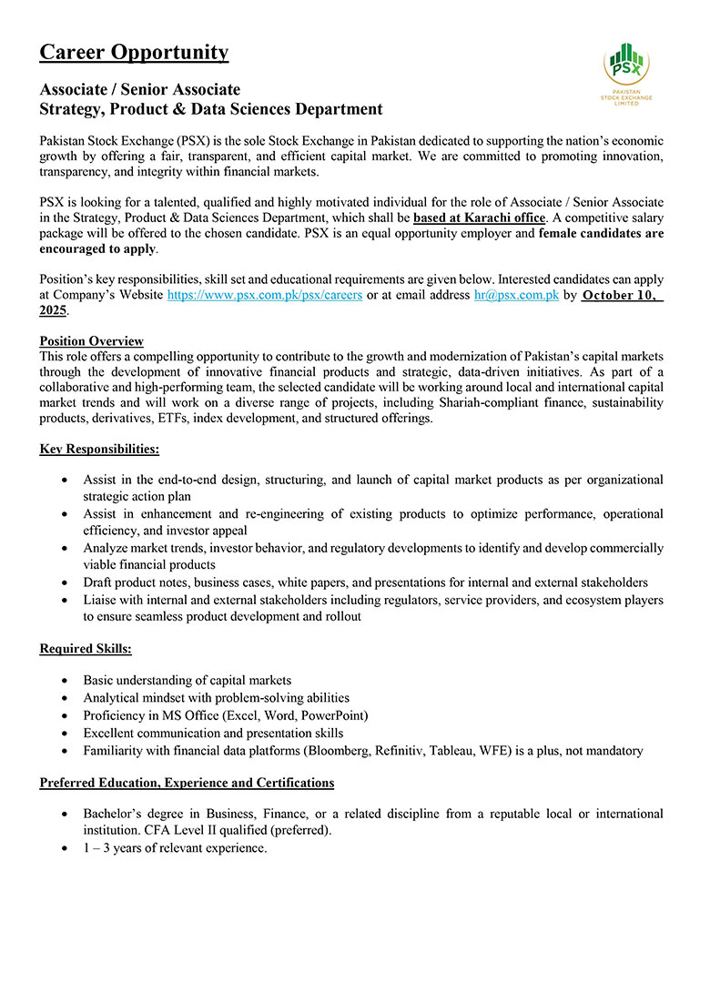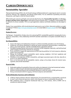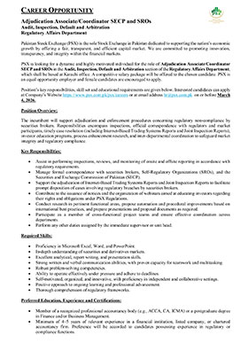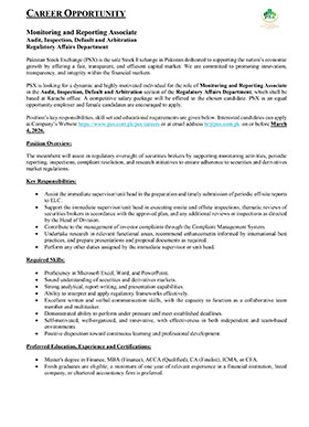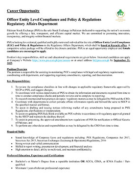 Much like the dynamism of the Pakistan Stock Exchange, we encourage dynamic and driven individuals to come forward and join our team of dedicated professionals at the Pakistan Stock Exchange. PSX is an equal opportunity company supporting diversity and inclusivity in our human resource. We are a company which provides for a sound source of job satisfaction along with fair prospects for career and individual growth.
