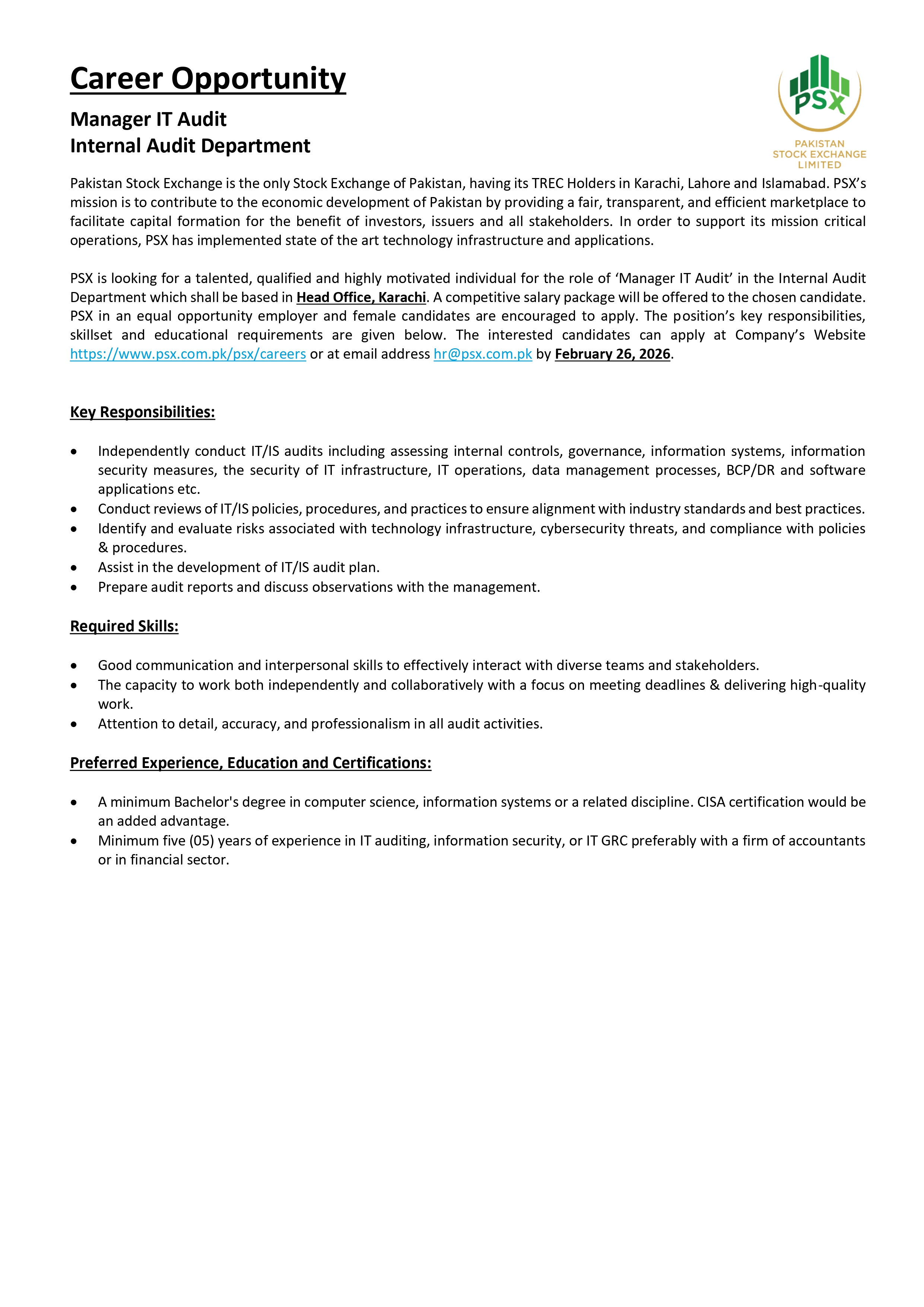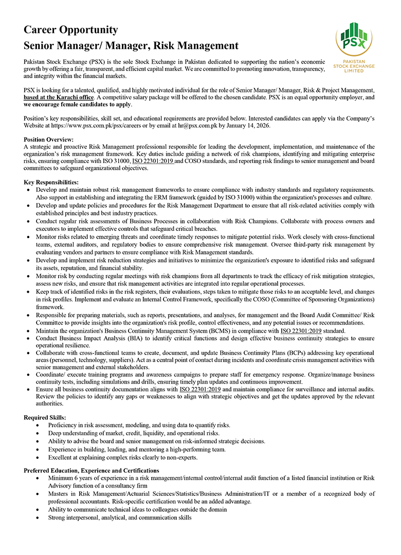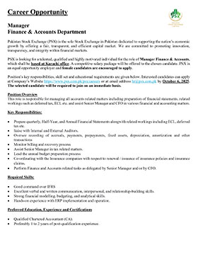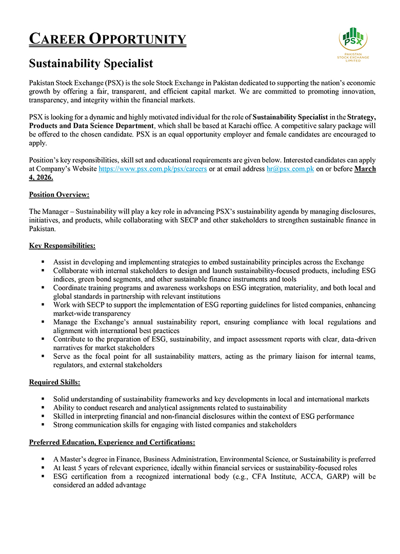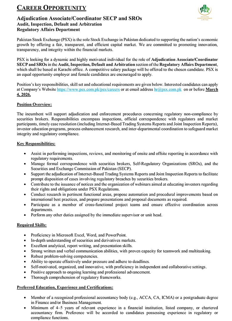 Much like the dynamism of the Pakistan Stock Exchange, we encourage dynamic and driven individuals to come forward and join our team of dedicated professionals at the Pakistan Stock Exchange. PSX is an equal opportunity company supporting diversity and inclusivity in our human resource. We are a company which provides for a sound source of job satisfaction along with fair prospects for career and individual growth.