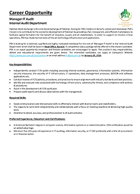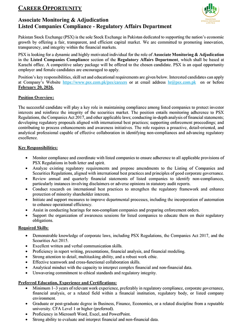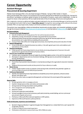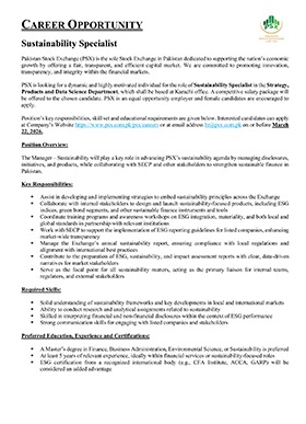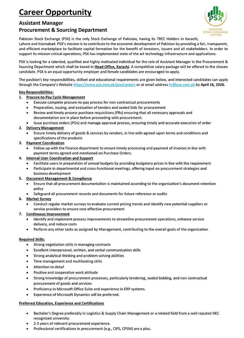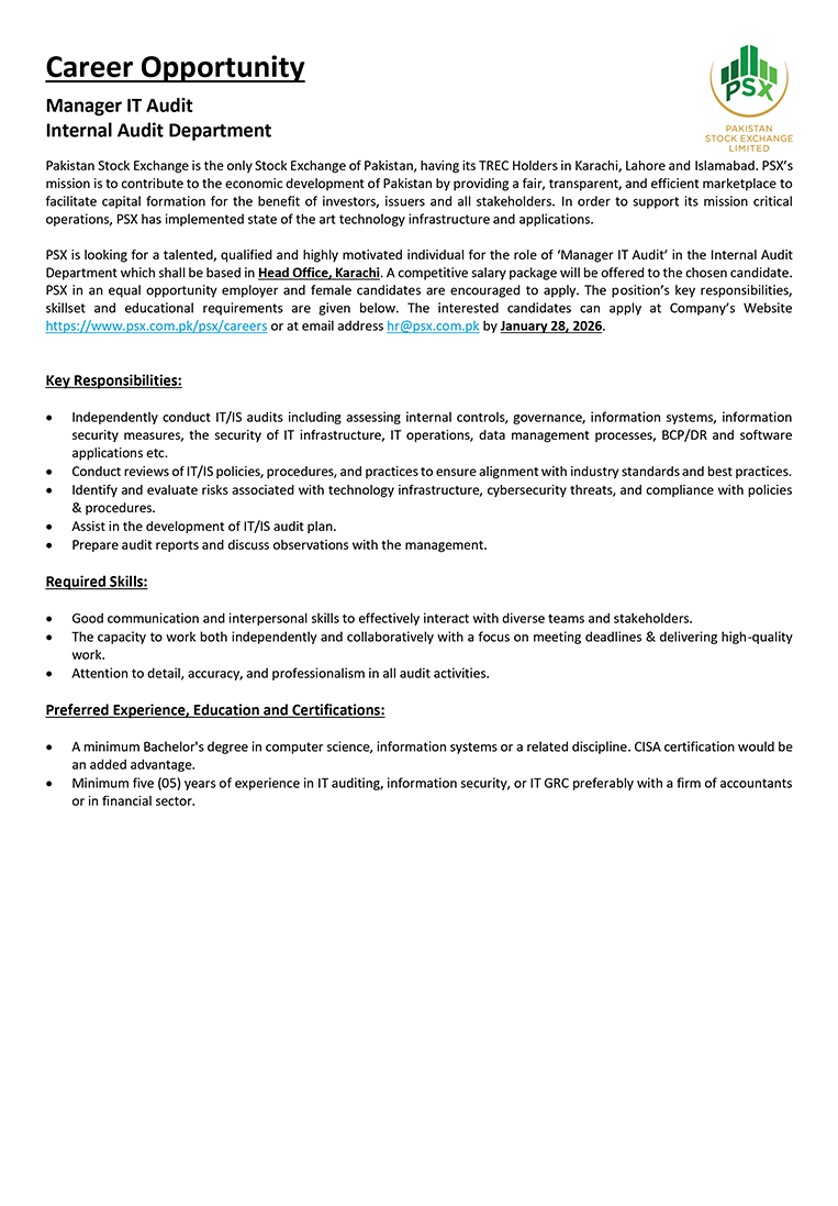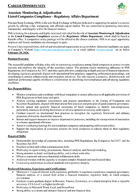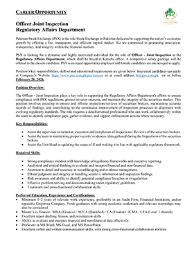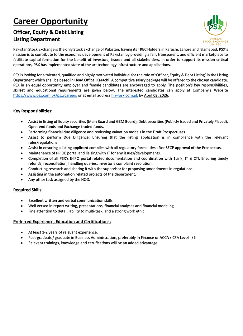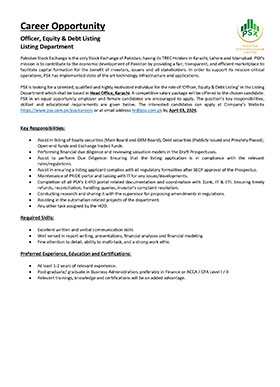 Much like the dynamism of the Pakistan Stock Exchange, we encourage dynamic and driven individuals to come forward and join our team of dedicated professionals at the Pakistan Stock Exchange. PSX is an equal opportunity company supporting diversity and inclusivity in our human resource. We are a company which provides for a sound source of job satisfaction along with fair prospects for career and individual growth.