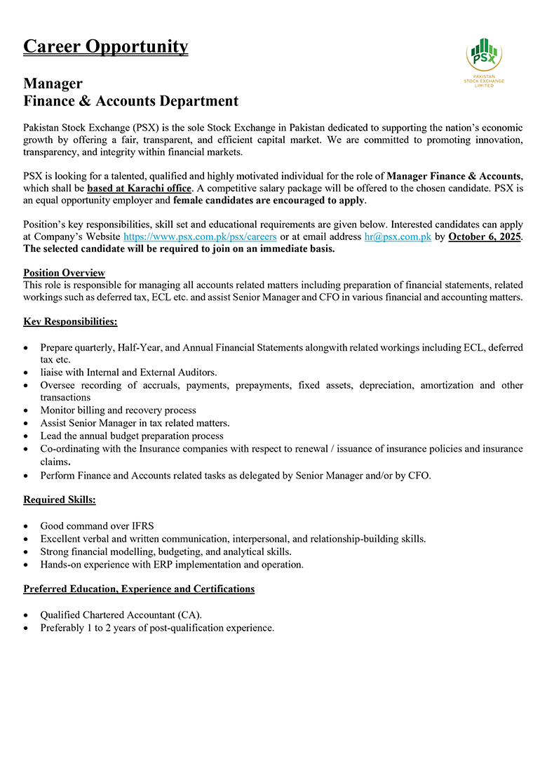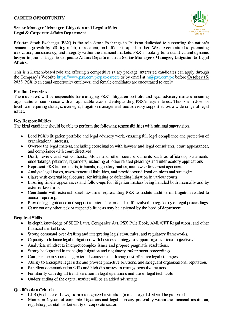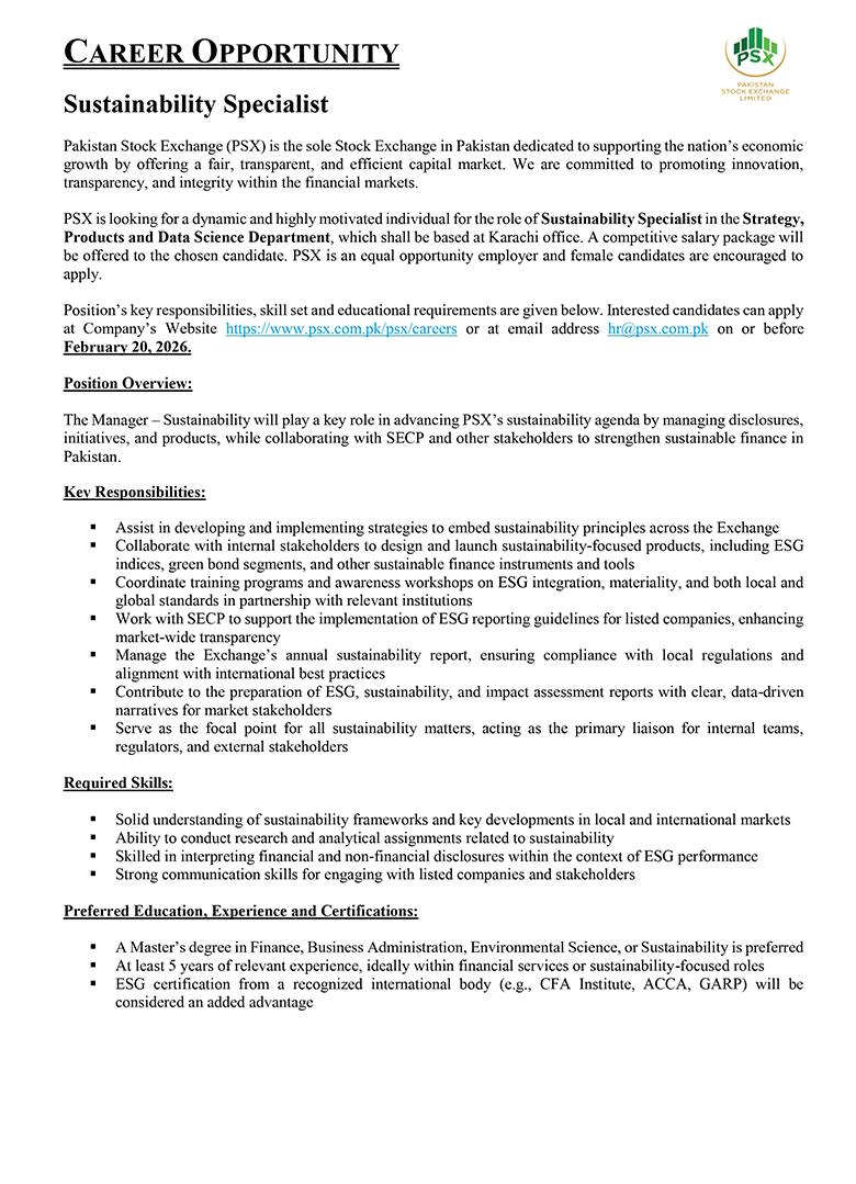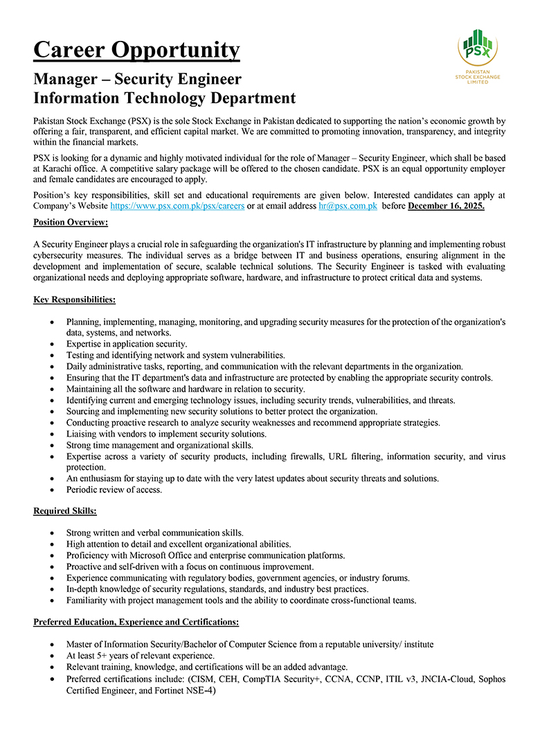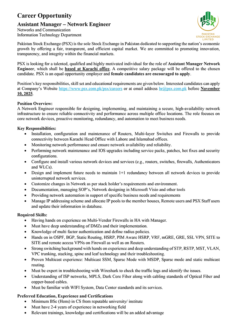 Much like the dynamism of the Pakistan Stock Exchange, we encourage dynamic and driven individuals to come forward and join our team of dedicated professionals at the Pakistan Stock Exchange. PSX is an equal opportunity company supporting diversity and inclusivity in our human resource. We are a company which provides for a sound source of job satisfaction along with fair prospects for career and individual growth.