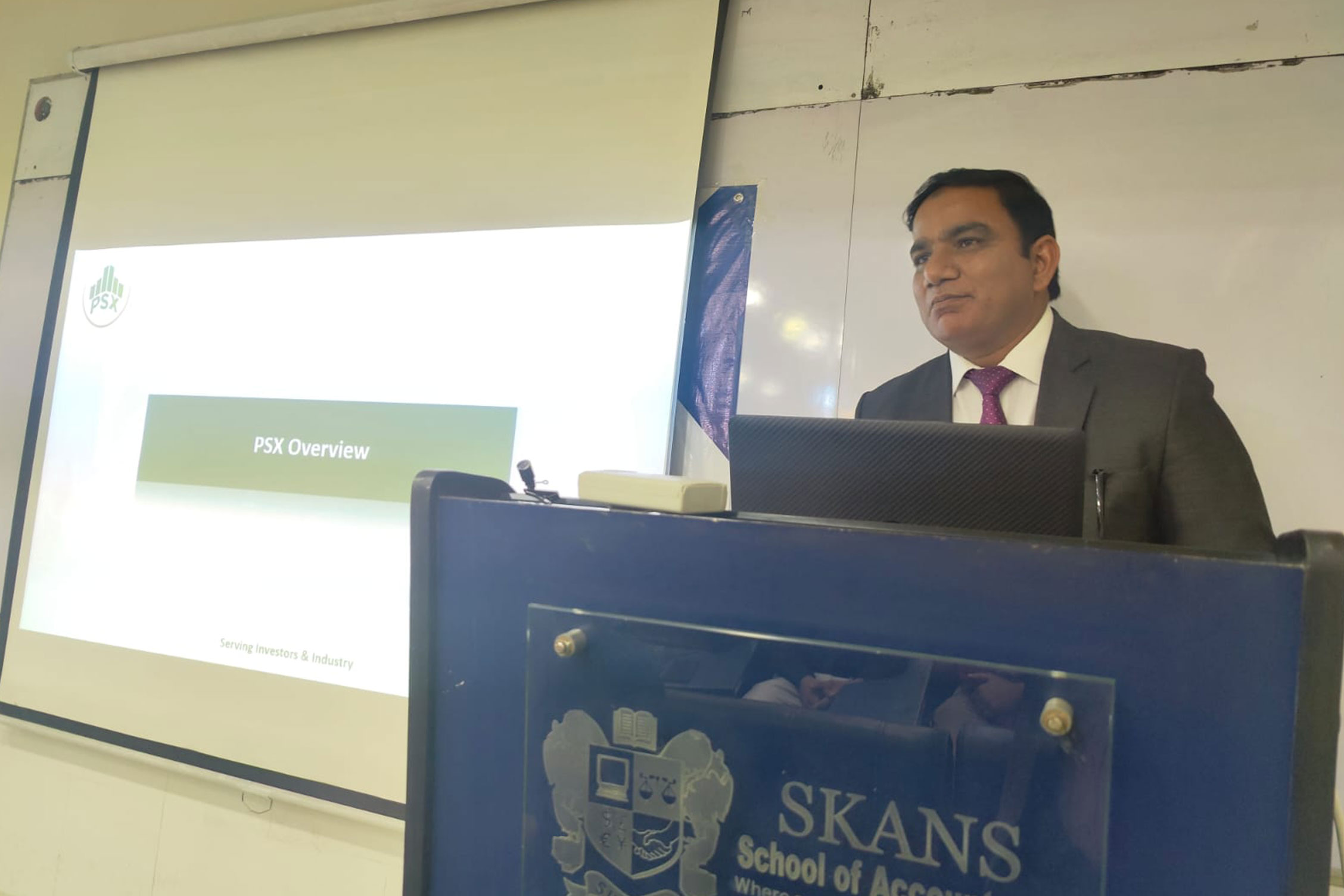 Pakistan Stock Exchange (PSX) along with a securities broker, Yasir Mehmood Securities (Pvt) Limited, jointly conducted an Investor Awareness Session for professional students of SKANS Abu-Bakar Campus Lahore. This was part of the PSX Financial Literacy Initiative to inculcate awareness among the youth on investment, particularly equity investments in the stock market, and the role of the capital market in the economy of Pakistan. The participants were apprised about how to open a brokerage account, how to select stockbrokers, and how to navigate the PSX website. This was an informative and productive session for all participants as Pakistan Stock Exchange continues its efforts to disseminate investor awareness and education to the general public, specifically to the youth. The representative from Yasir Mehmood Securities also explained the overall functions and operations of a brokerage house. Concludingly, there was an interactive Q&A session where students and their faculty members asked several questions with regard to the Stock Exchange and investing in the Primary and Secondary market. At the end of the session, the faculty of SKANS appreciated PSX’s efforts for the awareness of investors and furthering the development of the capital market.