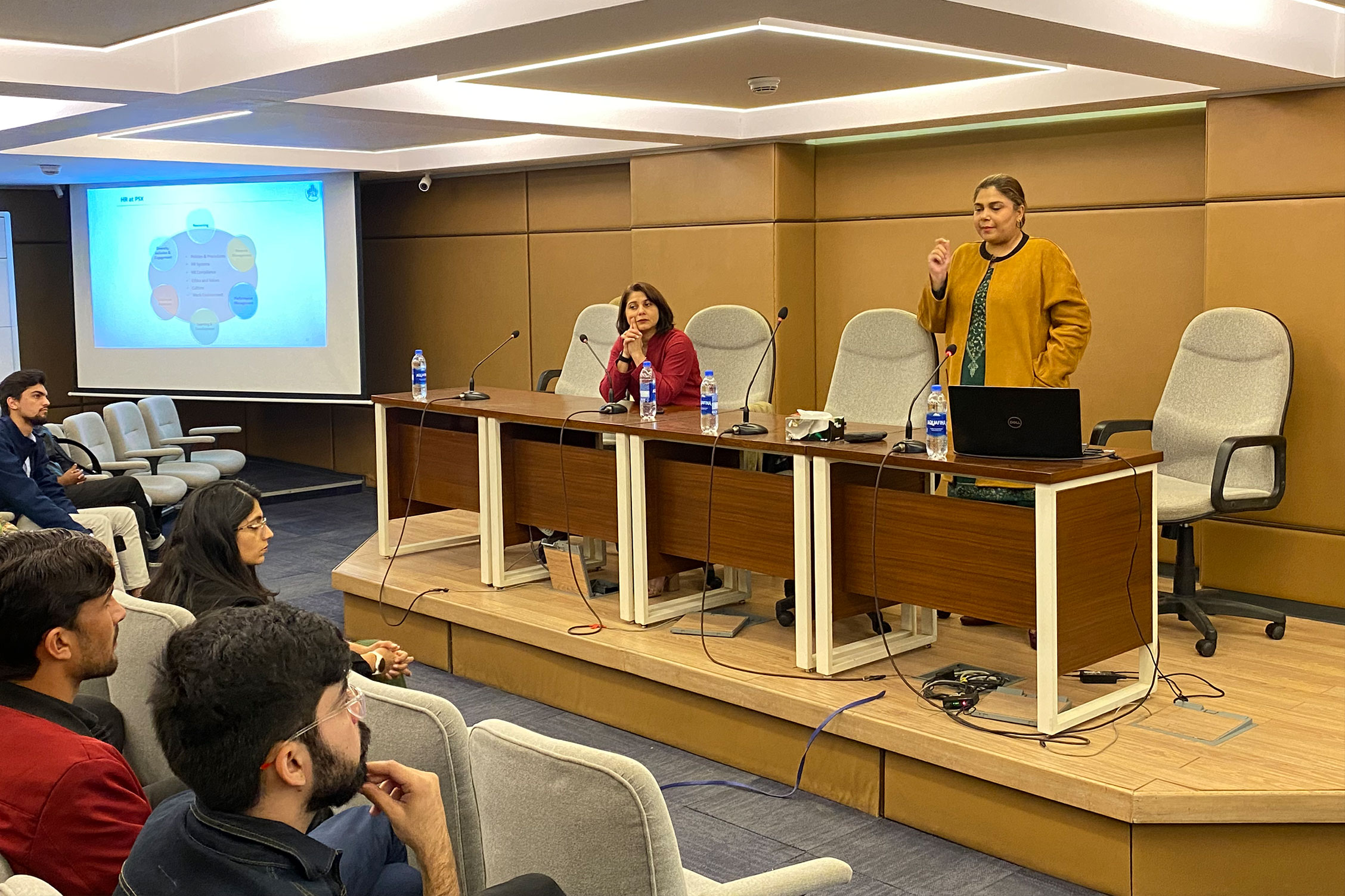 Pakistan Stock Exchange (PSX) conducted an Investor Awareness Session for students of IBA University HR Club. The purpose of the session was to help students understand how PSX works, the working culture and HR practices at PSX. The session was led by Ms. Raeda Latif (Chief Marketing & Business Development Officer) who introduced Pakistan Stock Exchange and its functions to the participants and by Ms. Sanam Kohati (Head of HR) who gave insights on HR processes, HR targets and its challenges at the Stock Exchange. Students learned about activities performed at the Stock Exchange, particularly HR processes & challenges thereof, gained insights into HR targets, and got a briefing on the functions & workings of the Stock Exchange. Later on, the IBA Karachi faculty and its students were given a tour of the PSX Trading Hall and premises.